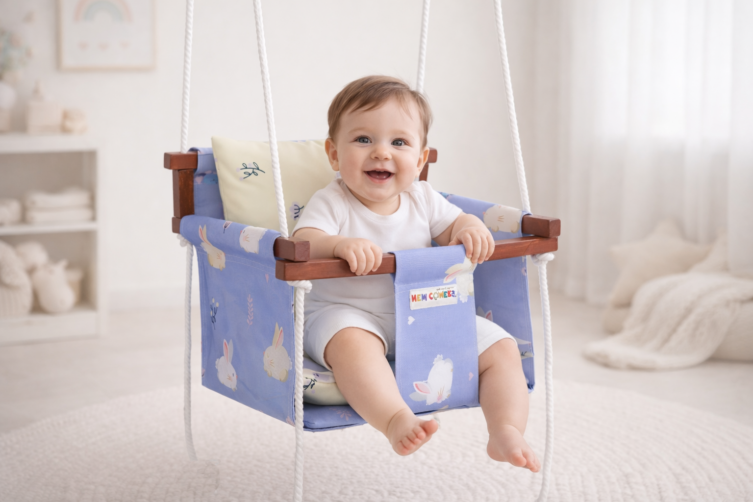 - SET : 1 Swing , 2 Pillows (Micro Recron Filing) for Back Support and Seat ,2 (S type Hook) to Adjust Height ,1 Wooden seat with Cotton Cover that Gives Complete Comfort to Your Kid.
